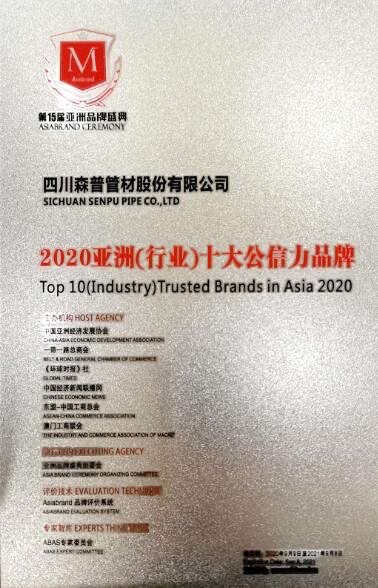 四川森普管材股份有限公司榮獲“2020亞洲品牌500強”及“2020亞洲(行業(yè))十大公信力品牌”榮譽稱號!
