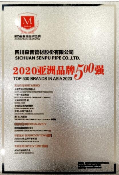 四川森普管材股份有限公司榮獲“2020亞洲品牌500強”及“2020亞洲(行業(yè))十大公信力品牌”榮譽稱號!